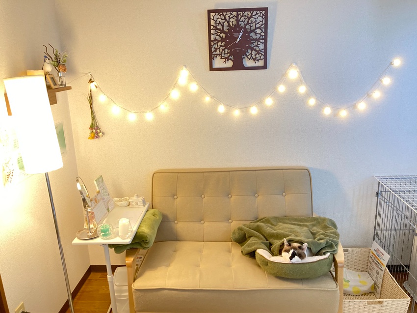 お客さまにお茶を飲んでおくつろぎ頂くソファーですが、半分は看板猫わんたんが陣取っておりますので、半分こでお願いします😽💕