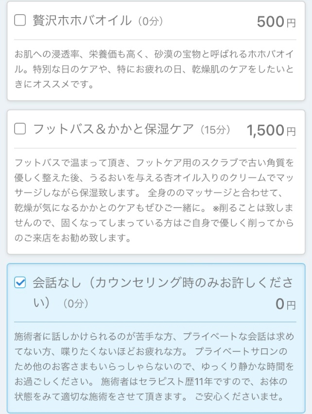 『マッサージ受けたいけど施術してくれる人と喋りたくない…』という方へオプションを追加しました♪・疲れて会話する元気もないとき・会話が苦手な方喋らなくてOKです!ぜひ気兼ねなくお越しください(*´ー`*)